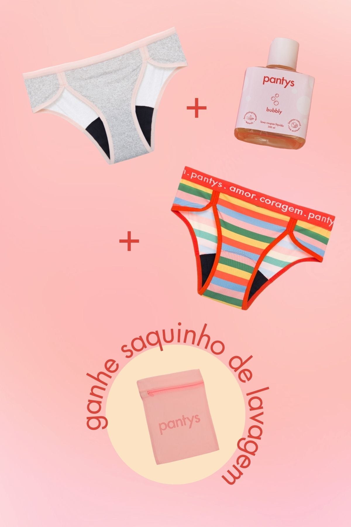 o kit para garantir o conforto que todas merecem neste volta às aulas! duas calcinhas de fluxo intenso que garantem horas de proteção e um sabonete bubbly que é ideal para a lavagem das pantys, seja no banho ou na máquina de lavar! nesse kit você ganha um saquinho de lavagem!